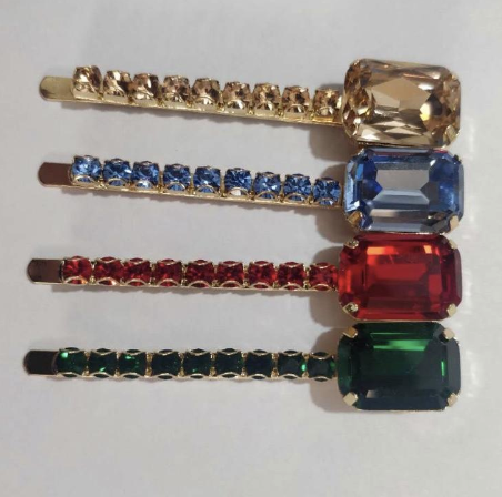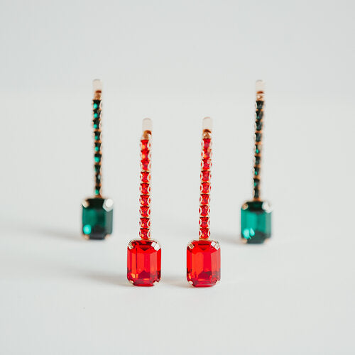 A row of emerald green glass crystals to get glimmer in your hair, just slide this pair of luxe bobby pins on to elevate any outfit and feel good!