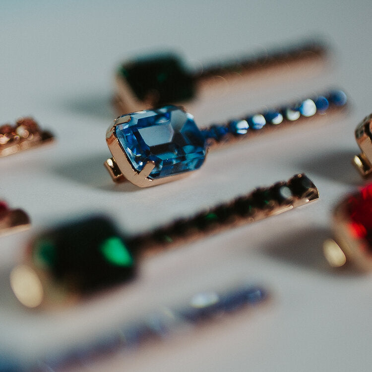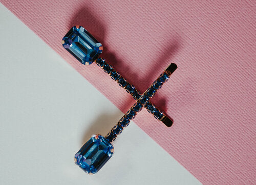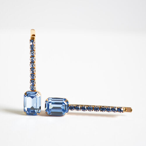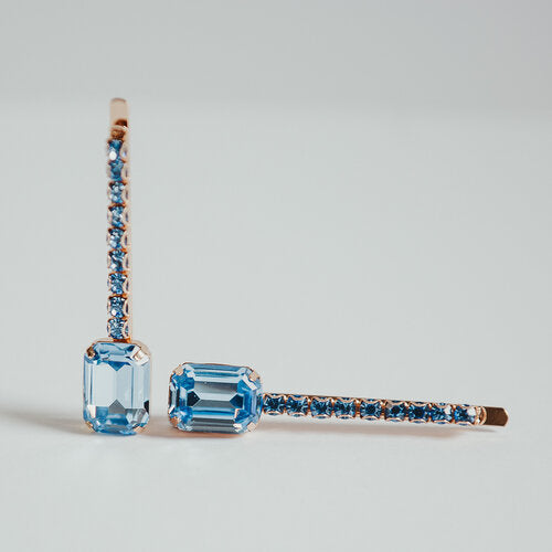 A row of sky blue glass crystals to get glimmer in your hair, just slide this pair of luxe bobby pins on to elevate any outfit and feel good!
