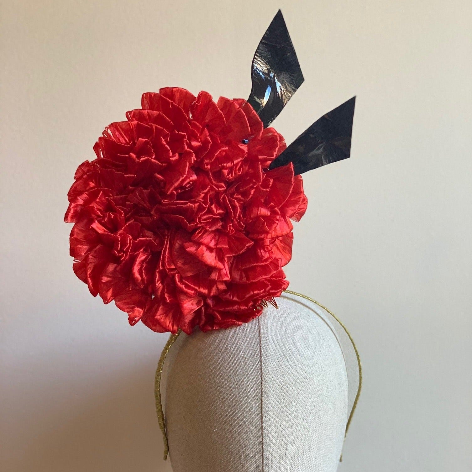 A soft vintage braid sculpted into a floral mould, with a beautiful velvet dome back and leather modern leaves.