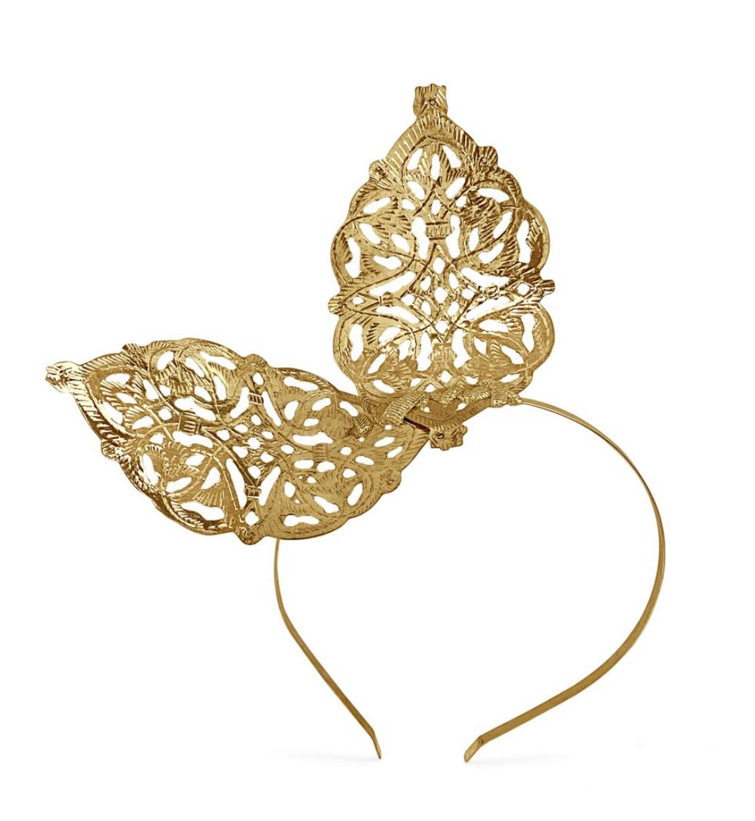 Gold metal engraved pieces uniquely sculptured on a headband.