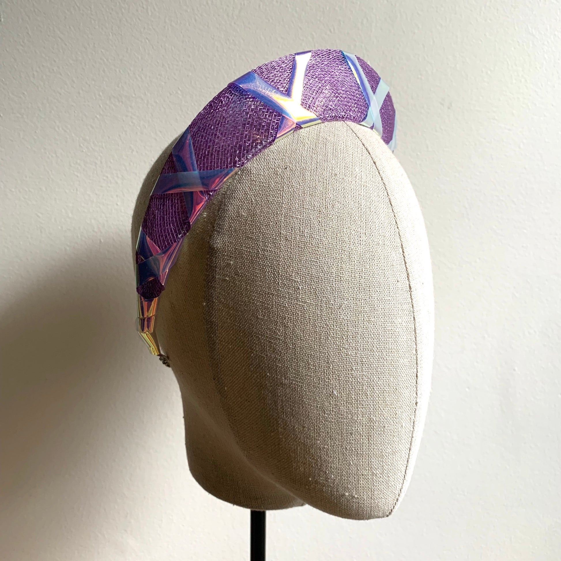 This crown is hand made with an elastic attaching the two ends and is a super light weight straw base crescent crown with an hologram ribbon wrapped back and front.