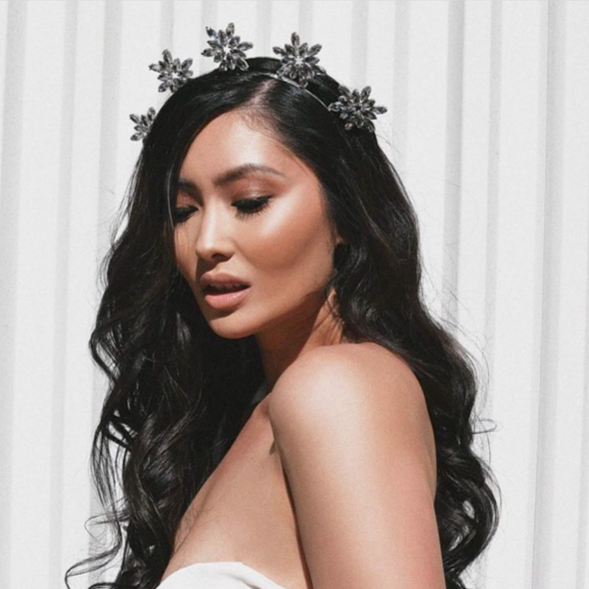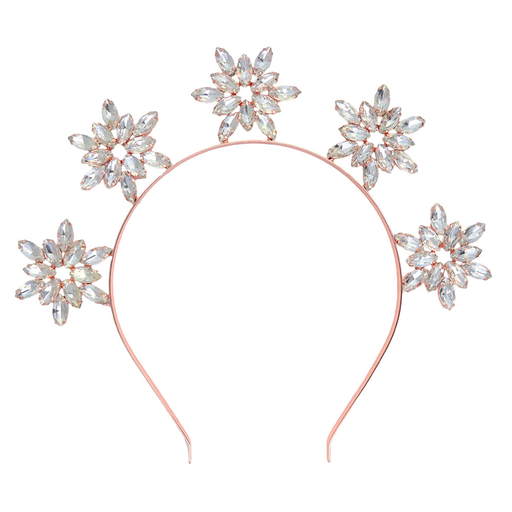 Spectacular glass crystals adorned into snowflake clusters on a headband plated in rose gold.