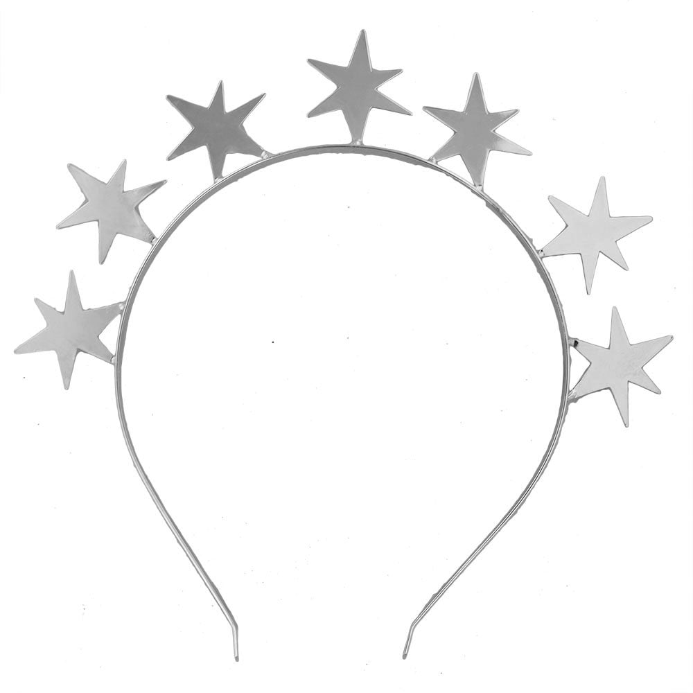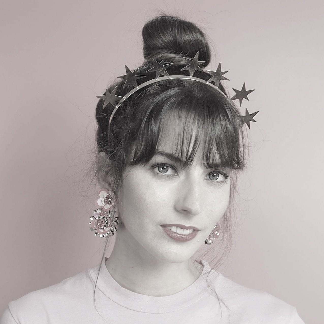 A starry headband in silver rhodium plating sitting delicately on the head.